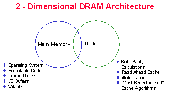 Typically, the most common application of DRAM, the first dimension, in most hardware architectures is inside the host system, as main memory. Main memory offers very fast access and very high bandwidth for all data that is located there. However, this memory is completely volatile. If the host system experiences power loss or must be rebooted for any reason, all data in main memory will be lost and must be recreated. Because of volatility, main memory is used only for storing data being read and for write buffers waiting to be flushed to disk. Primary uses are buffers, global cache, named cache and O/S management. Often, a high performance system configuration will have 1-4GB of DRAM configured in main memory.