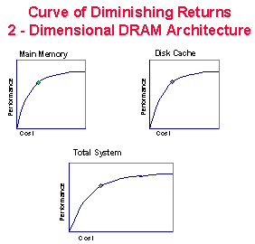 Savvy systems administrators know that the penalty for a cache miss is high. Therefore, systems should be configured with very large amounts of both system memory and disk cache. However, Pareto's law applies: the initial 20% of the memory will handle 80% of the I/O activity. Beyond that point, as memory is added, the resulting performance advantage declines. A system configured with 1GB of system memory may receive a 20% improvement by adding another 1 GB of memory. Adding a third GB will add only 15% more and adding a fourth GB may result in only 10% improvement. In each case, the cost of the 1 GB of memory was the same, so the net value received for dollars invested declines dramatically as the total amount of memory increases. The effect of this is that a 2-D architecture for high performance is very expensive since the net performance gain for each dollar invested is declining; yet the system administrator must highly configure the system to achieve acceptable performance.