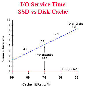 The third dimension is used to systematically place the "hot" data spaces in DRAM. By permanently caching this data, it is possible to move over half of the total physical I/O load to the SSD DRAM area. The remaining 40-50% of physical I/O activity leaves a light load for the disk cache to handle. As a result, the majority of the physical I/O activity is serviced in under .5 ms, and most of the remaining 30% is serviced at disk cache speeds (approximately 4 ms). Figure 5 below shows the effect changing disk cache hit ratios have on disk service time and compares them to SSD service time.